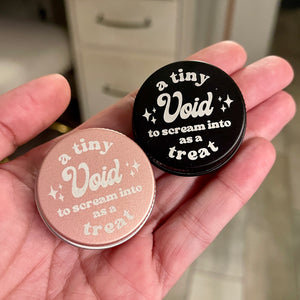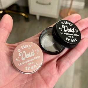 This tiny rose gold tin is engraved with "A tiny little void to scream into as a treat". A silly little gag gift for a friend who could use a pick me up.
