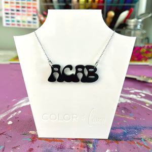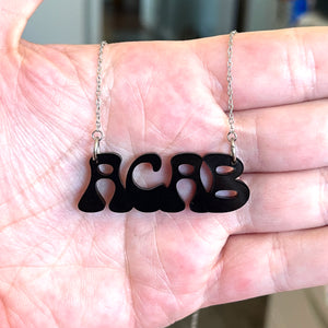 Short, sweet and to the point - our ACAB necklace is just that: the centerpiece reads ACAB in black acrylic in a bottom-heavy groovy font.