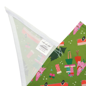 Our Busy Season print features a pair of gal pals out finishing their Christmas errands, arms stacked high with wrapped gifts, and a Christmas tree tied to their cute little car. Snowflakes and more gifts fill the air, and the whole adorable retro scene is on a lovely olive green background.
