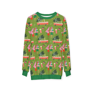 Our Busy Season print features a pair of gal pals out finishing their Christmas errands, arms stacked high with wrapped gifts, and a Christmas tree tied to their cute little car. Snowflakes and more gifts fill the air, and the whole adorable retro scene is on a lovely olive green background.