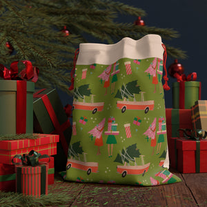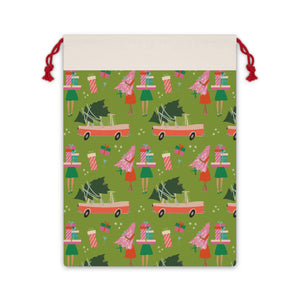 Our Busy Season print features a pair of gal pals out finishing their Christmas errands, arms stacked high with wrapped gifts, and a Christmas tree tied to their cute little car. Snowflakes and more gifts fill the air, and the whole adorable retro scene is on a lovely olive green background.