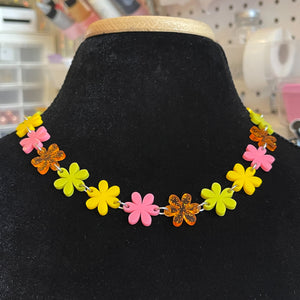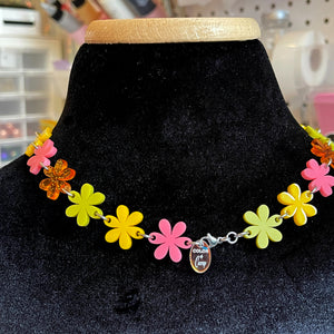 This necklace is heavily inspired by one of my favorite childhood game shows with retro daisies in pink, chartreuse, mustard yellow, and translucent orange with glitter!