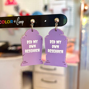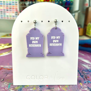 Lavender craggly tombstones are engraved with “Did my own research” in a spooky font, highlighted in white.