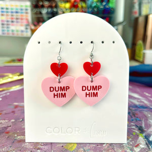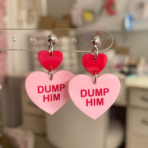Pink candy hearts engraved with "DUMP HIM” in red dangle from smaller red hearts, because there's no such thing as too many hearts for Valentine's Day.