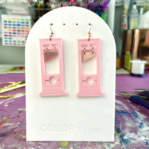 Nothing says eat the rich like indulging in a pair of over the top guillotine earrings. Remind the ruling class that things like single payer healthcare are guillotine insurance... in iconic blush pink and rose gold, naturally! Rose gold mirror blades round out the sheer camp of these beauties.