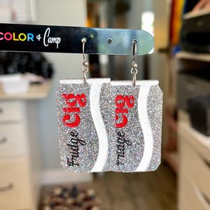Soda cans cut from silver holographic glitter acrylic have a wavy white stripe and a black and red "Fridge Cig" logo.