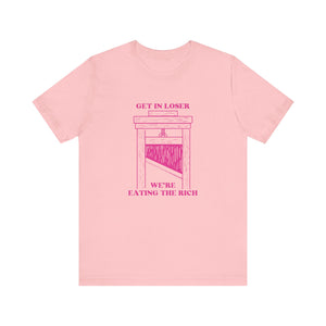 A pink guillotine surrounded with the text "Get in loser, we're eating the rich" also in pink, all on a pink shirt, of course!