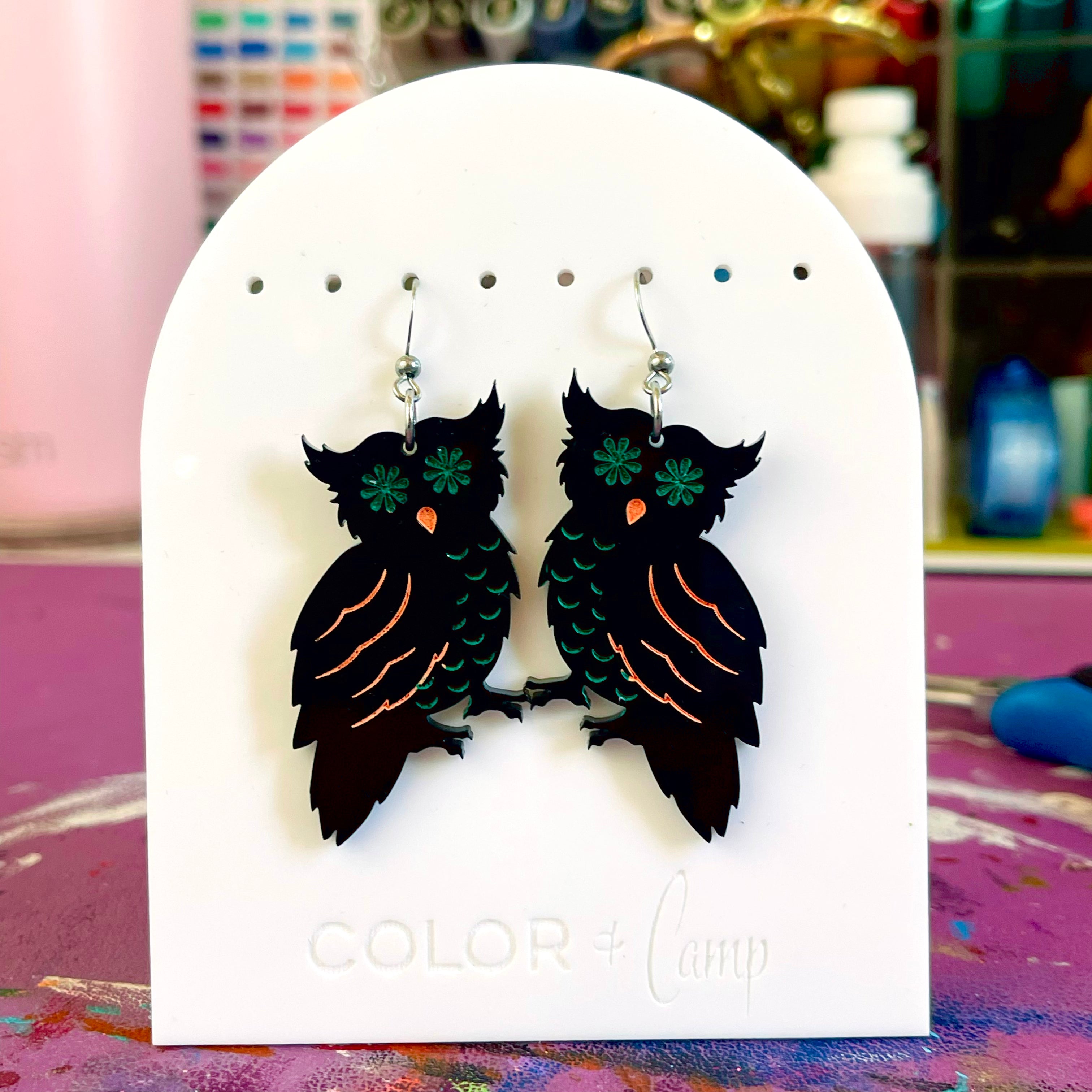 My grandma collected owls during the late 70s into the 80s and these spooky little groovy owl earrings are inspired by her. Black owls with orange and green accents and daisies for eyes scream 70s nostalgia.