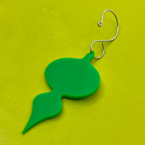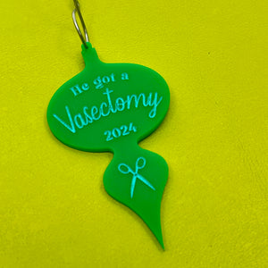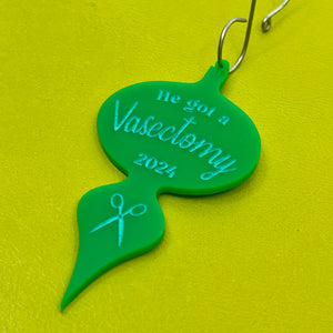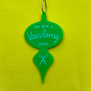 This cute little retro shaped ornament is cut from grass green acrylic. It reads "He got a Vasectomy" with a little pair of scissors and the year in aqua blue. It comes with a handmade ornament hook.