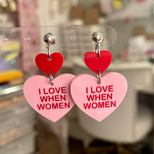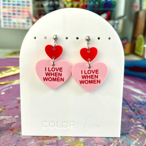 Pink candy hearts engraved with "I LOVE WHEN WOMEN” in red dangle from smaller red hearts, because there's no such thing as too many hearts for Valentine's Day.