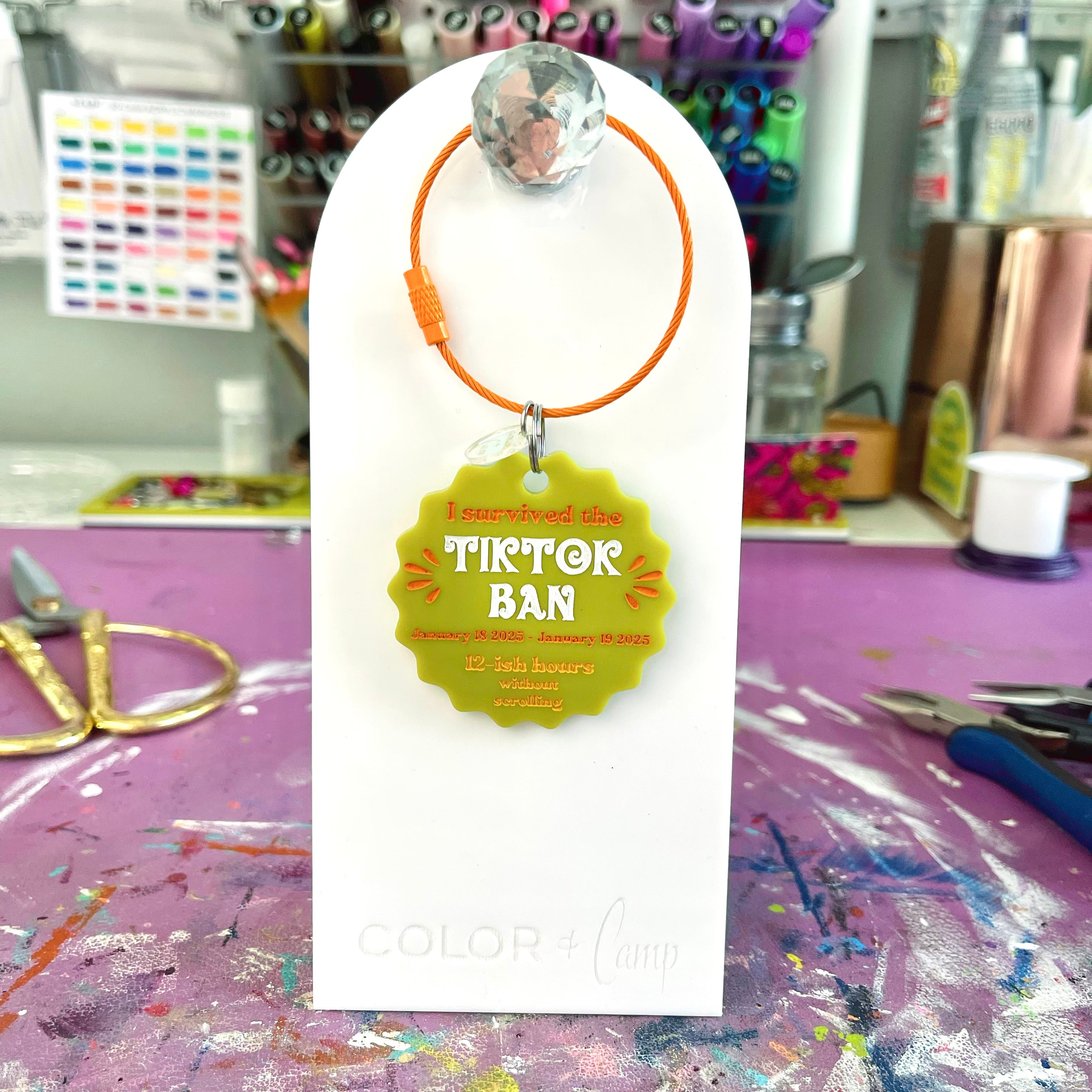 We did it, y'all! We survived the TikTok Ban! This 70s inspired retro keychain reads "I survived the TikTok Ban - January 18 2025 - January 19 2025. 12-ish hours without scrolling".