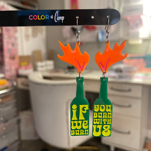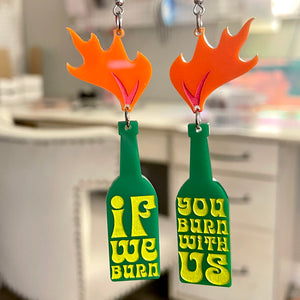 Green wine bottles are engraved with "If we burn you burn with us" in a groovy 70s font and highlighted in chartreuse. They dangle from orange acrylic flames and your choice of earring.