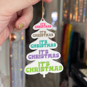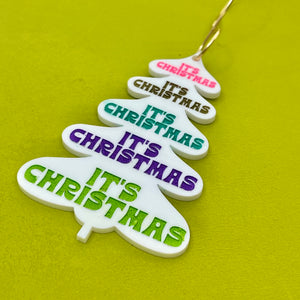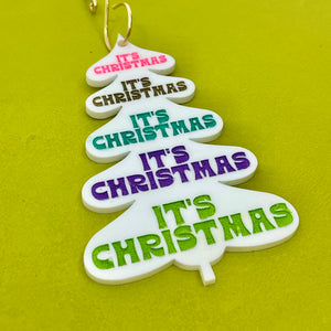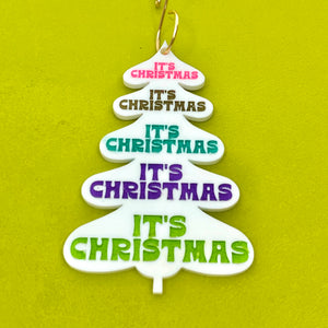 For the friend who is REALLY into Christmas, we have this ultra-colorful, retro groovy "It's Christmas!" ornament. This white mid-century inspired tree shape is adorned with the text "It's Christmas" not once but FIVE times, each painted a different vibrant color.