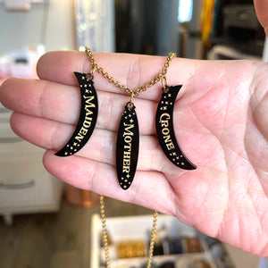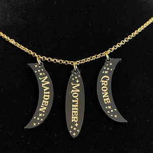 Our Mother Maiden Crone necklace features three (elongated) moon phases, each engraved respectively with "mother", "maiden", and "crone" in bright gold.