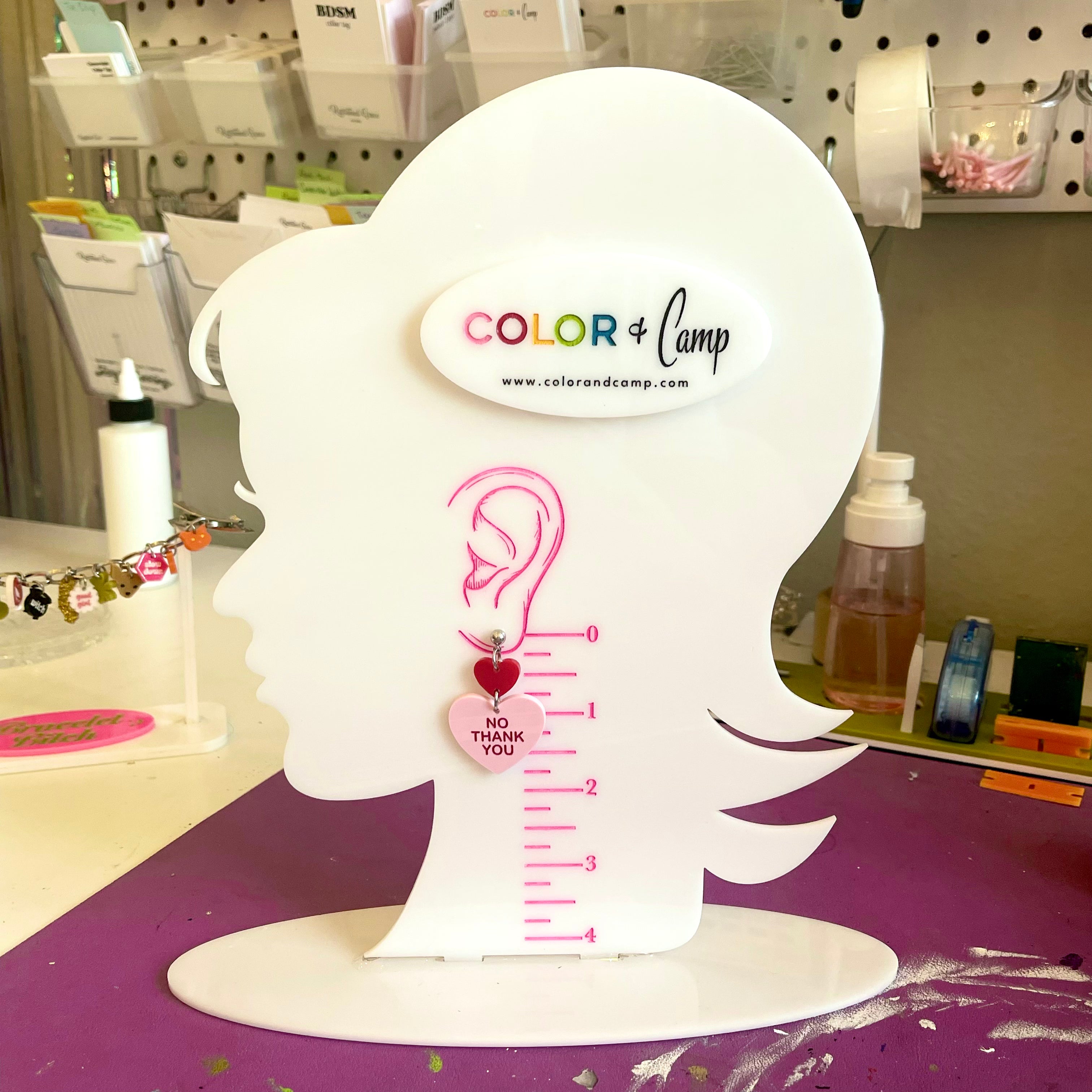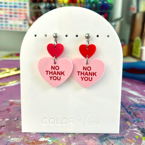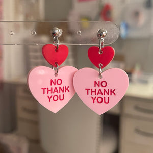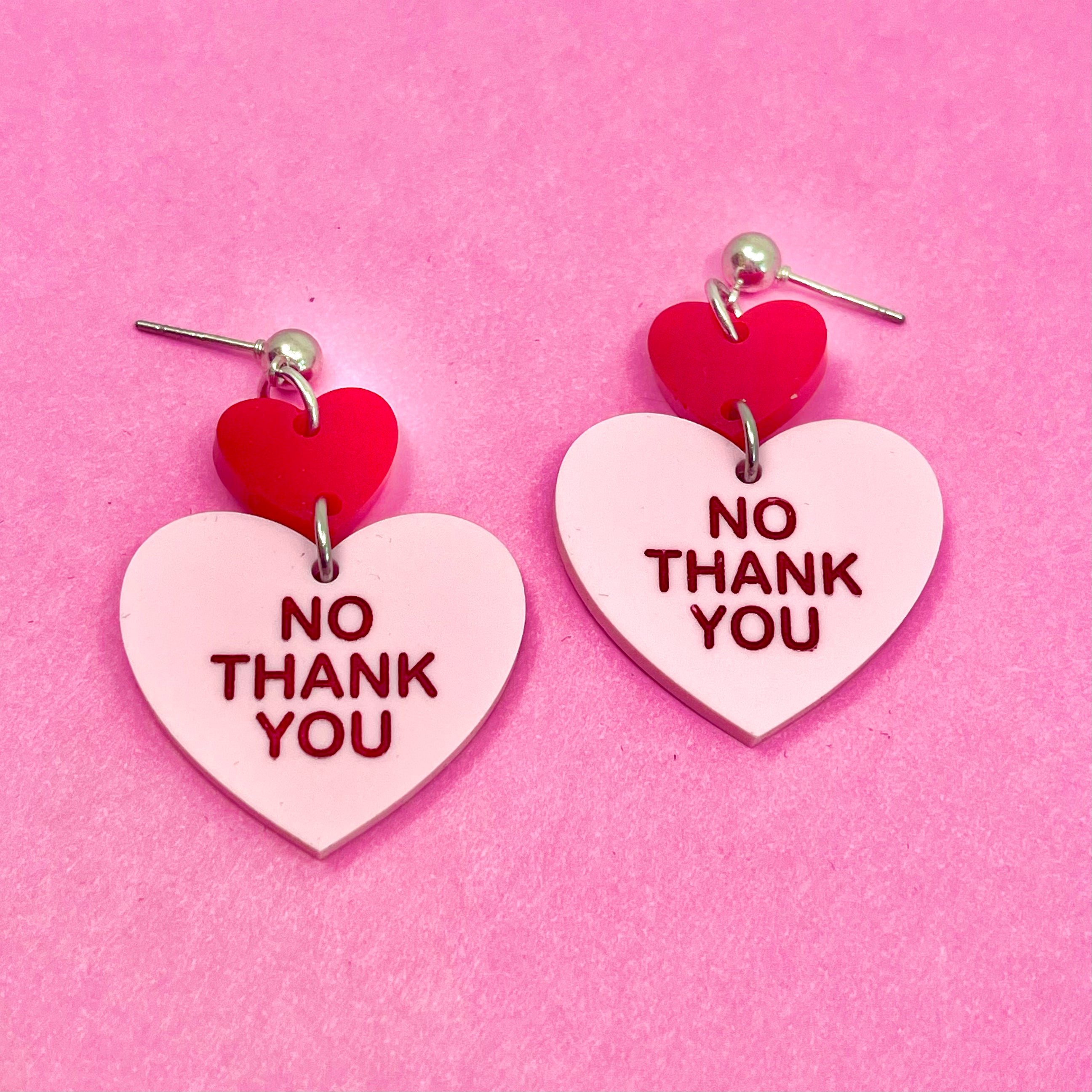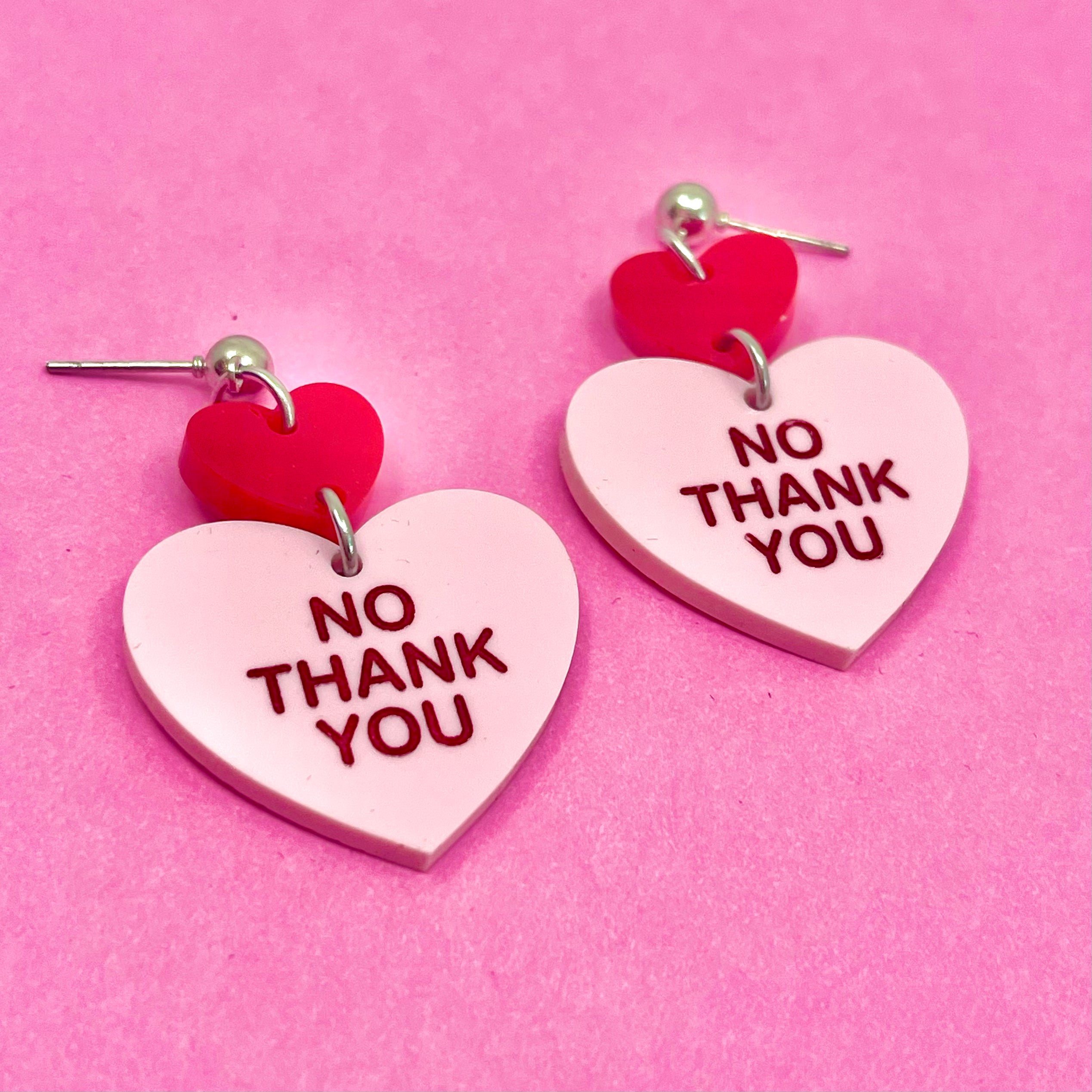 Pink candy hearts engraved with "NO THANK YOU” in red dangle from smaller red hearts, because there's no such thing as too many hearts for Valentine's Day.
