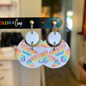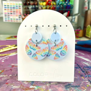 Our Pretty Pollinator earrings are a limited edition of 3 pairs, with hand painted rainbow butterflies on baby blue acrylic.