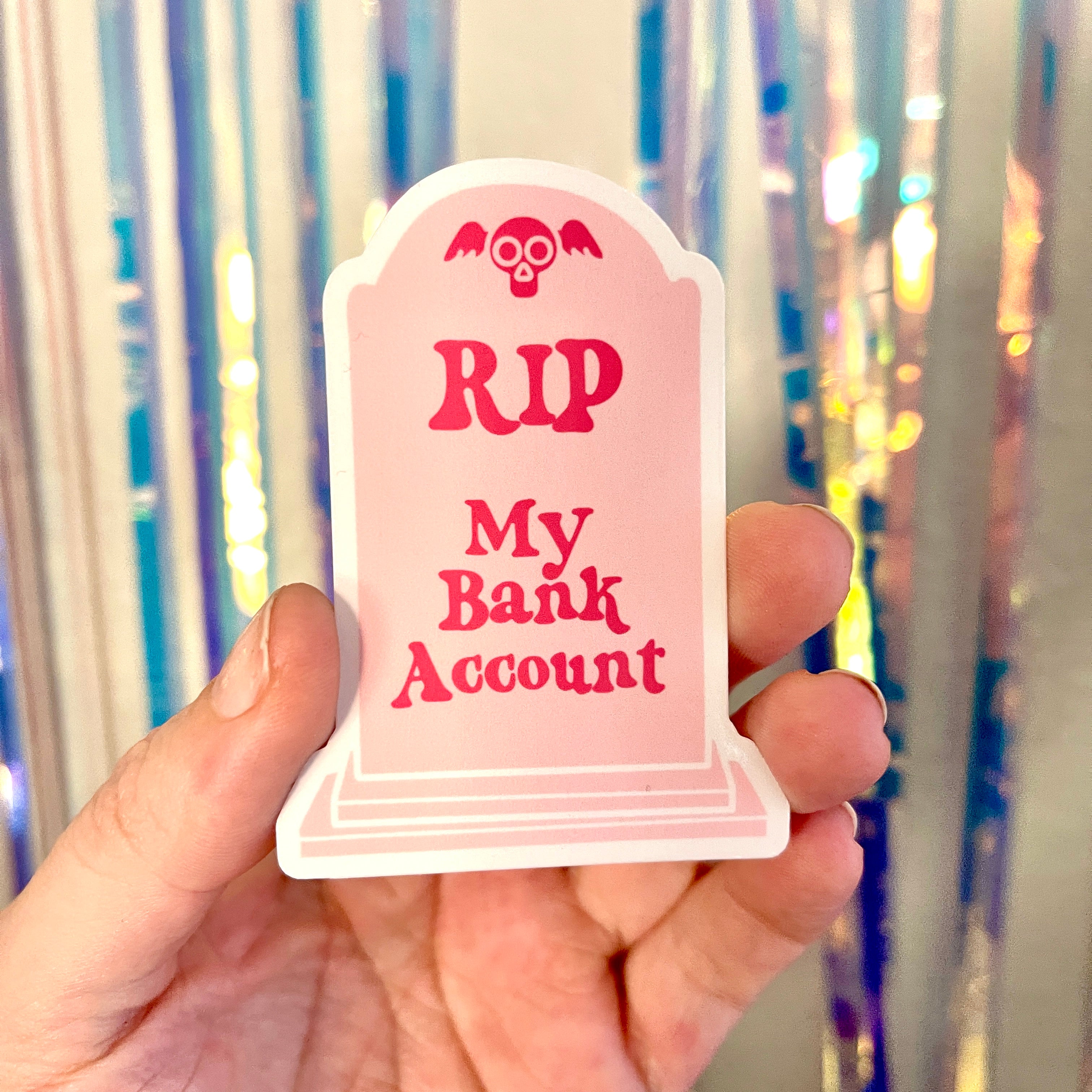 A pink tombstone reads "RIP My Bank Account" in hot pink retro text.