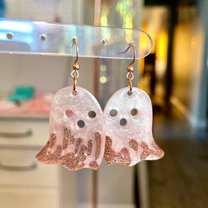 I had leftover resin from another project and as a result, we have three pairs of these adorable rose gold glitter "lava lamp" ghost earrings.