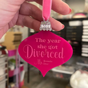 This retro ornament is cut from your choice of acrylic and engraved with "The Year She Got Divorced" and your new name.