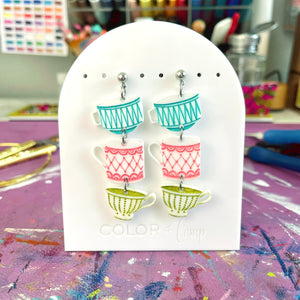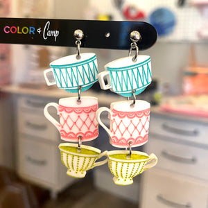 Our Tea Party earrings feature a stack of retro coffee and tea cups in white with turquoise, pink, and olive green highlights. Perfect for a garden party, afternoon tea, or coffee date!