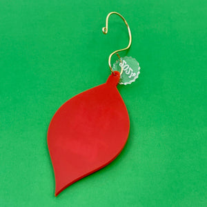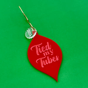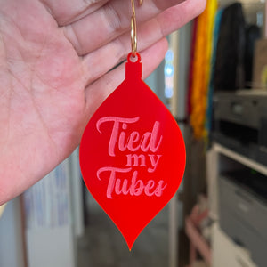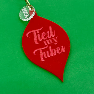 This cute little retro shaped ornament is cut from bright red acrylic. It reads "Tied My Tubes" in pink. It comes with a handmade ornament hook and a clear 2024 charm.