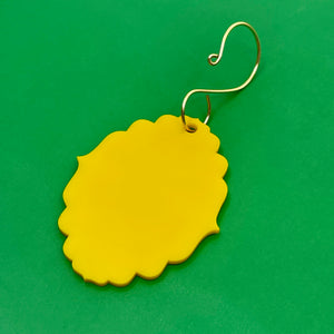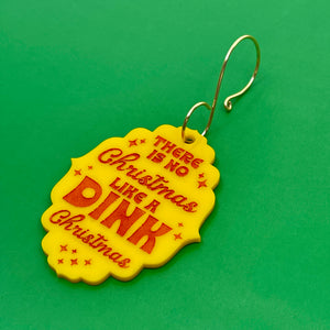 This retro ornament is cut from bright yellow acrylic and engraved in orange with "There is no Christmas like a DINK Christmas". It comes with a handmade ornament hook.