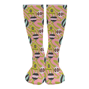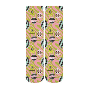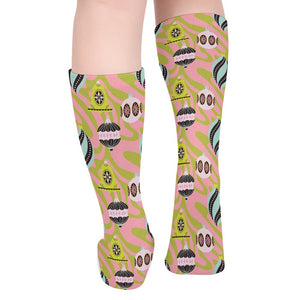 Our December Dopamine print is a retro mid-century meets 90s retro revival mashup with a groovy pink and green swirl background adorned with vintage-style ornaments in aqua, pink, and green, and a white pearl garland. If all you want for Christmas is some dopamine, this print will get you at least halfway there!