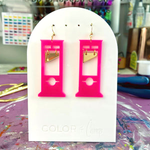 Nothing says eat the rich like indulging in a pair of over the top guillotine earrings. Remind the ruling class that things like single payer healthcare are guillotine insurance... in 90's doll vibes of hot pink and gold.