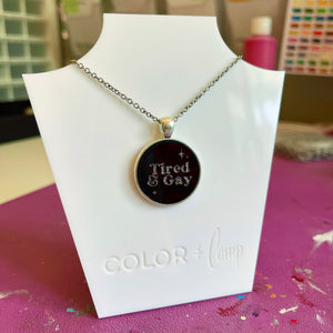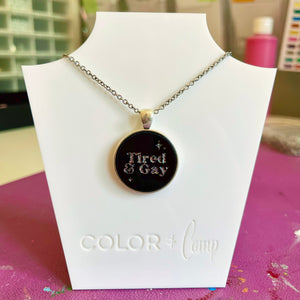 This little silver and black pendant is engraved with "Tired & Gay" filled with rainbow glitter. Happy Pride, y'all. I'm taking a nap.