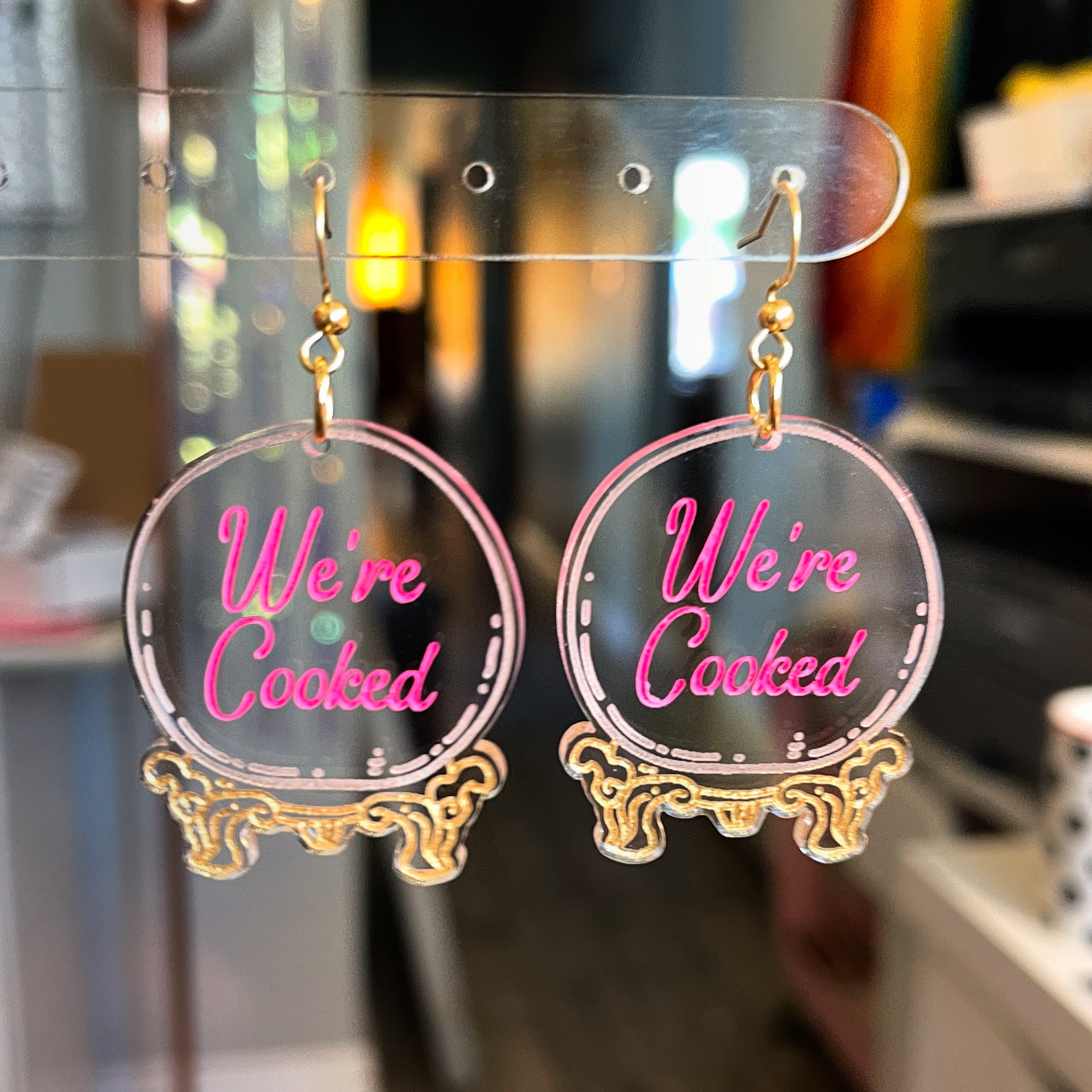 These clear acrylic crystal ball earrings are engraved "We're Cooked" in neon pink. The stand of the crystal ball is embellished in metallic gold.