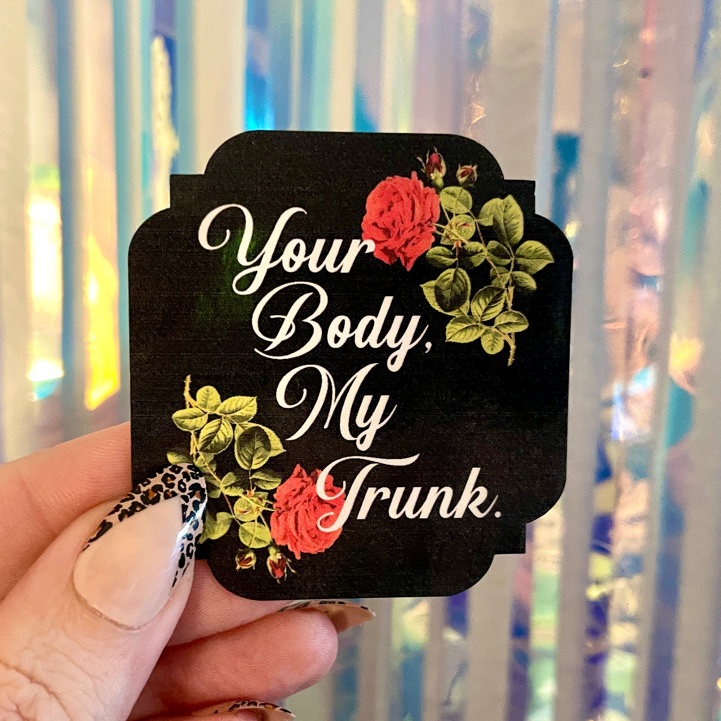 A direct response to these "Your body, my choice" men, our Your Body, My Trunk sticker is designed to get the point across anywhere you need it. Our Retro Goth version features a vintage romantic script font with red roses on a black background.